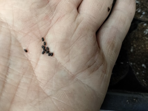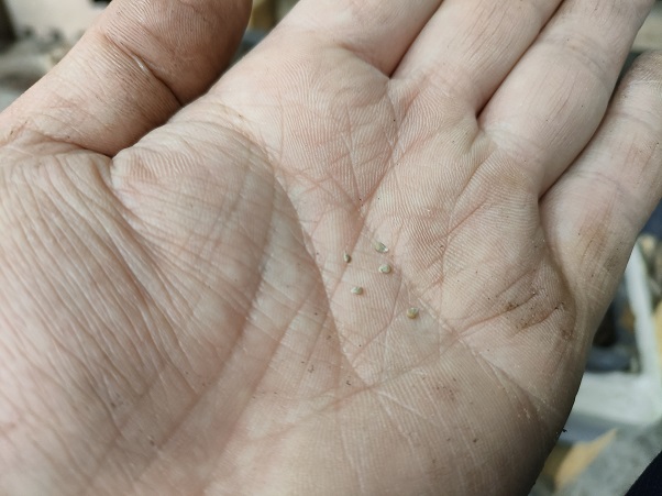 見えます?これ滅茶苦茶小さい野菜の種です。種の小さな野菜は沢山ありますが、これはトマトの種で今までこんな小さな種を見たことなかったので始めて見た時は発芽するか心配でしたがちゃんと発芽するんですよね。