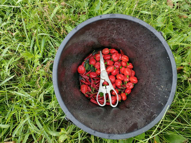 まずは雑草に覆いつくされても実を付けていた「黒唐辛子」と「ハバネロ」を収穫。