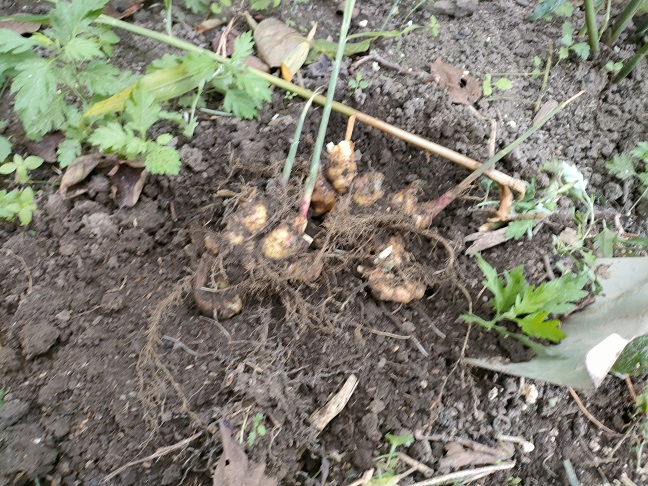 奥の二株だけ倒れて枯れていたので、収穫してみます。