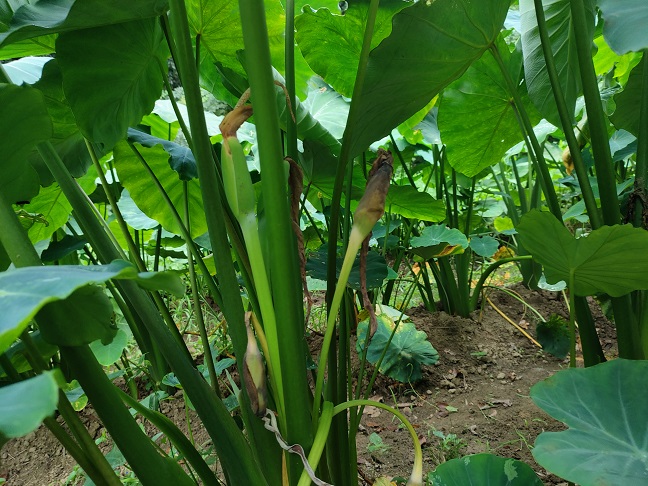 写真は枯れてしまった後のようですが、中々お目にかかれない花のようで、18年この地で里芋を栽培していますが初めて見つけることができました。