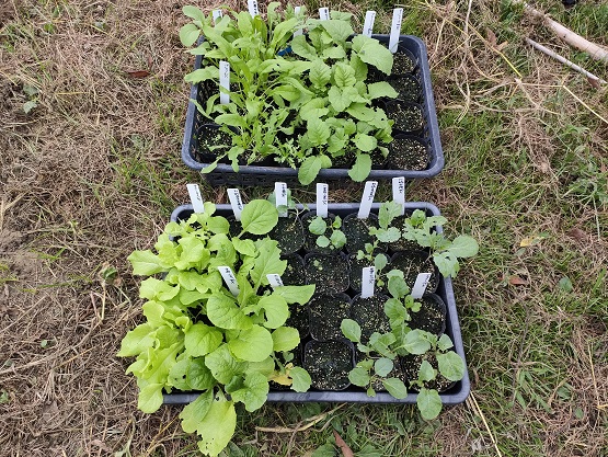 少し時期をずらして蒔いた「白菜」「キャベツ」「ブロッコリー」「からし菜」「みぶな」「サニーレタス」「春菊」「パセリ」を畑に定植します。