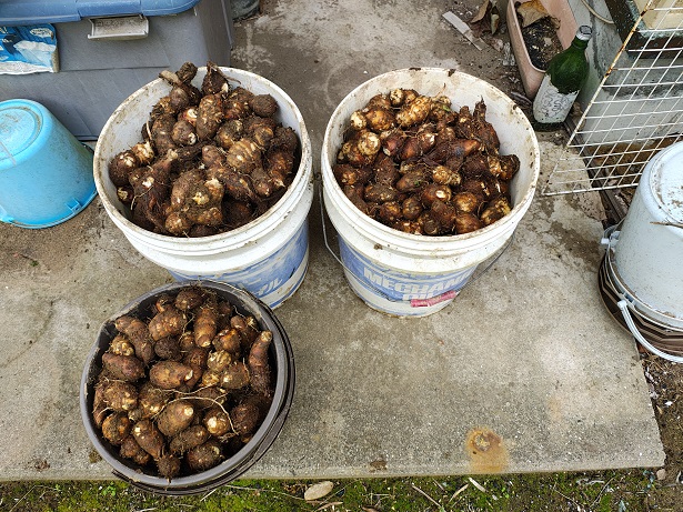 残る里芋は連作エリア3畝。流石に1人だと48株収穫でヘトヘト。