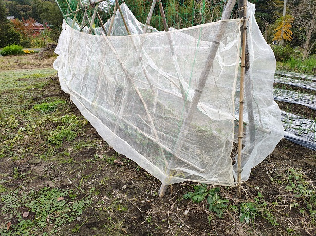 サクッと定植して、虫除けネットでヒヨドリやムクドリからの食害を防ぐと共に、霜よけにも期待です。