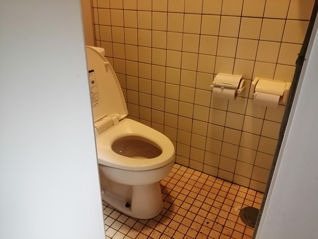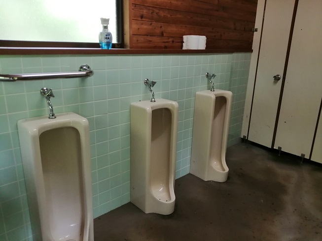 オートサイトBと林間サイト用のトイレがこちら。利用者が少ないからかサニタリーハウスよりも綺麗で臭いもありませんでしたが、残念ながら男性用トイレの個室が利用不可となっていたので、サニタリーハウスまで行く必要があるので注意が必要です(2019年8月5日情報)。