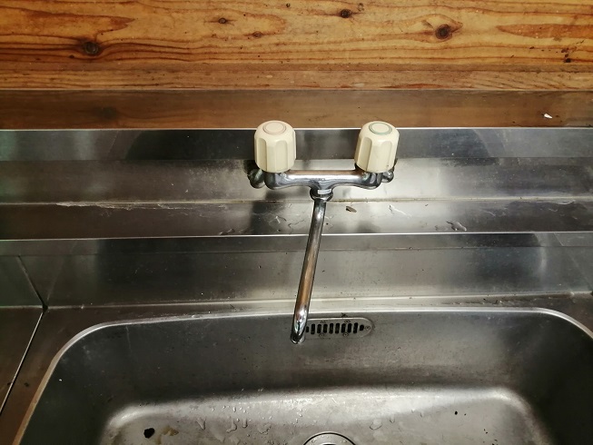 作業台もあり、使い勝手のよい炊事場です。中央にあるポリバケツに生ごみは捨てる事が出来ますが、トレイなどを捨てることはできません。