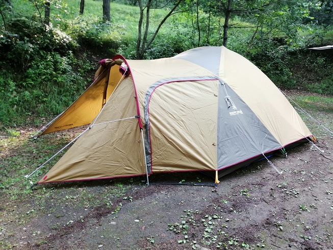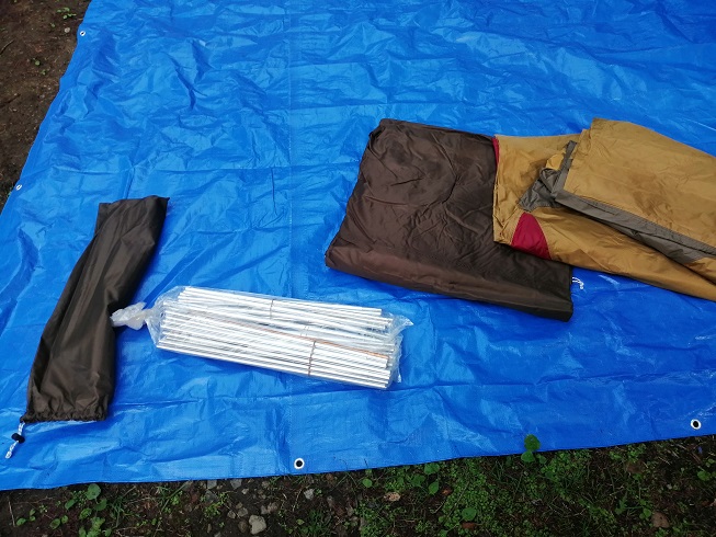 未使用テントではありますが、10年も放置してあったので、加水分解は避けられないとは思いつつサクッと設営していきます。ドームテントは悩むことなく設営できるのでいいですね。