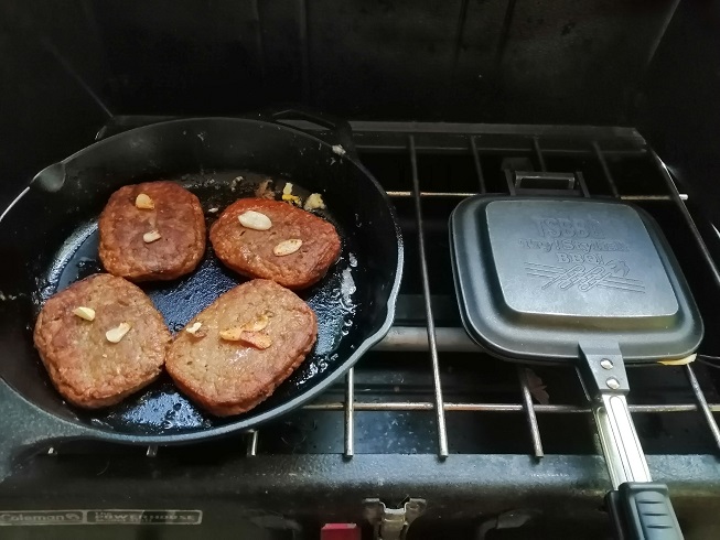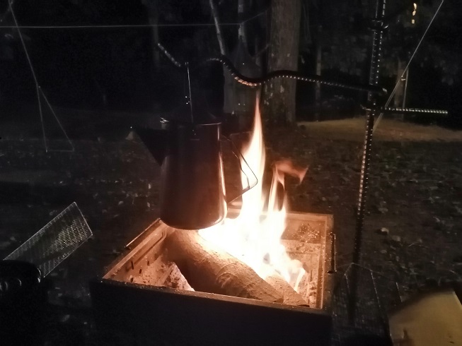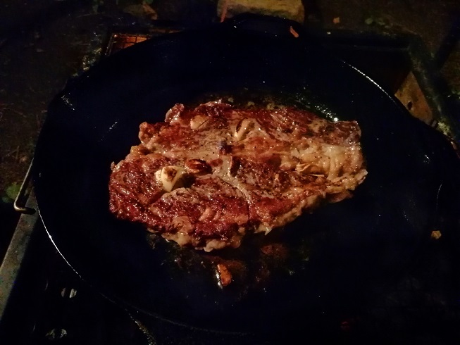 夕食は牛ステーキ。焚火で焼くだけで美味しく食べれるので忙しキャンプ初日には助かる食材ですね。