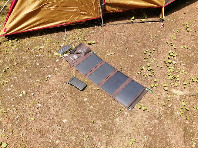 サイトに日光が届くようになったので「suaoki ソーラーチャージャー 28W」をつかって、モバイルバッテリーとLEDランタンの充電を行いました。夏の太陽が照り付けると3つ同時に充電できる優れもの、1日で2つのモバイルバッテリー&LEDランタンを半分ほど充電することができます。