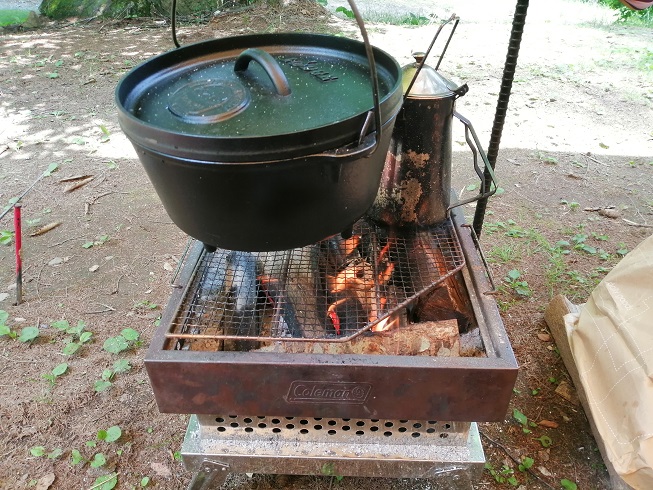 長男は朝から焚火とゆっくりと高原キャンプを満喫中です。