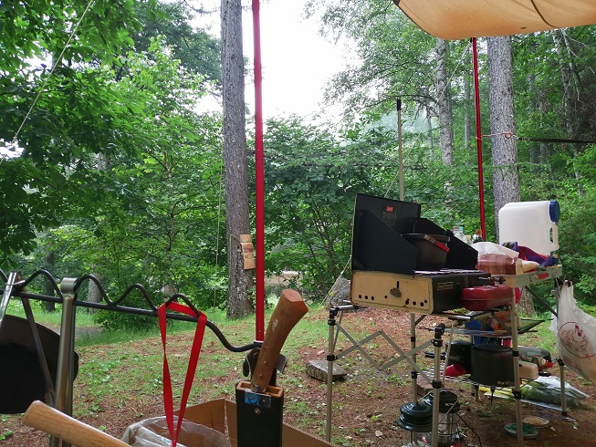テント内をレイアウト中、アイアンラックのアイアンを忘れるという失態に気が付きましたが、何となくレイアウト完了。ちょっとゴチャついていますがしょうがないですね。