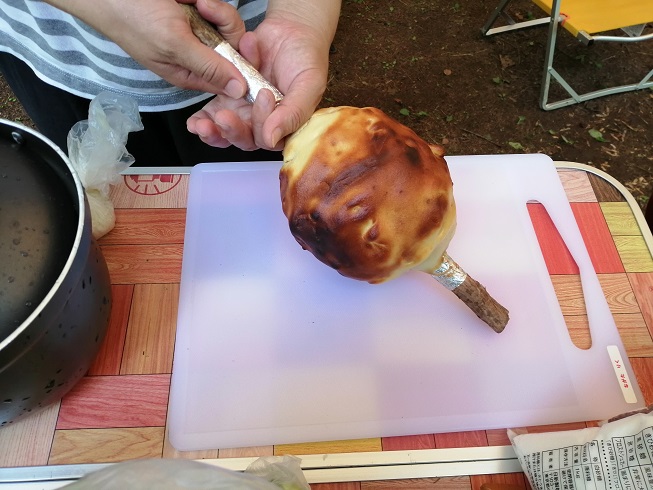 木の棒(皮を剥いで、形を整えたもの)にアルミホイルを巻いて、ホットケーキミックスを薄く塗って、クルクルと焚火の火で焼いては塗り、塗っては焼くを繰り返します。