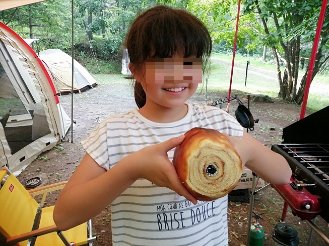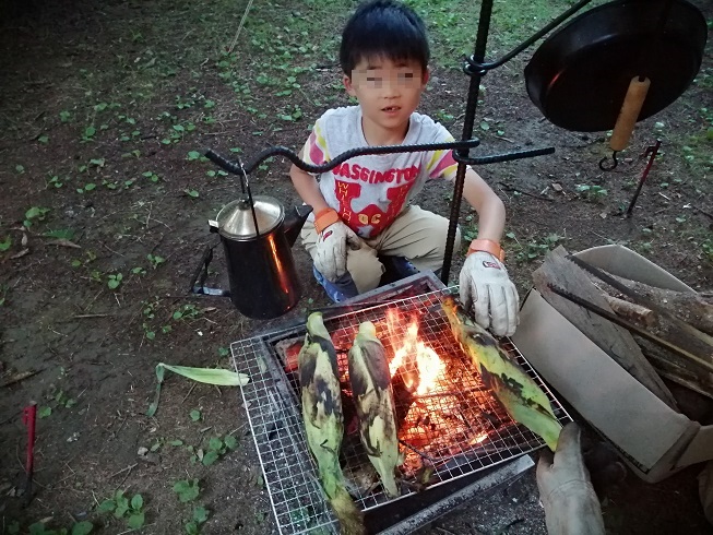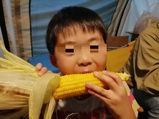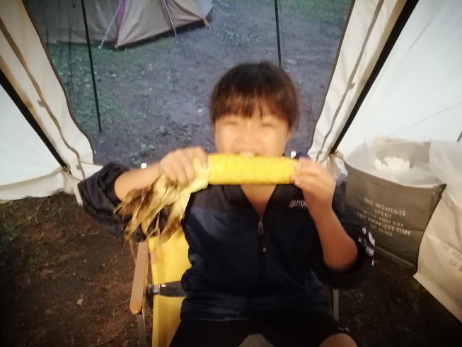 2人とも満面の笑みで、トウモロコシにかぶりついています。親としては子供のこんな姿が見たくてキャンプに行っているよなものですね。