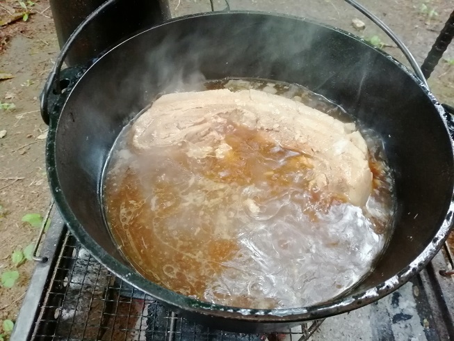 さて、本日はキャンプ場から出る予定はないので、夕食の角煮を作りながら、子供たちとバームクーヘンを作ります。