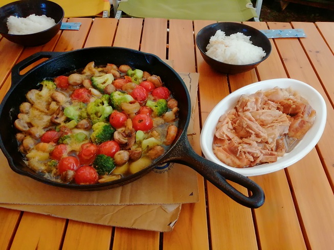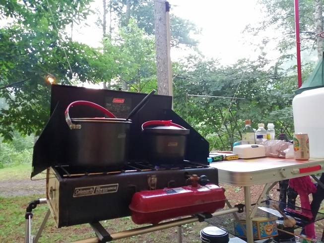 キャンプ場に戻ると薄暗くなってしまったので、大急ぎで夕食の準備に取り掛かります。