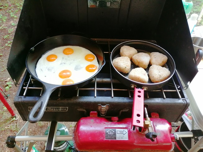 朝食は、ベーコンやソーセージを焼いて簡単にすませました。