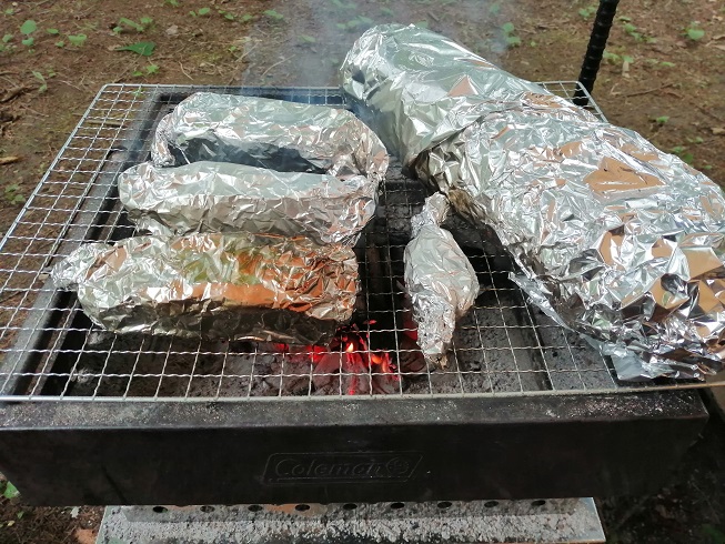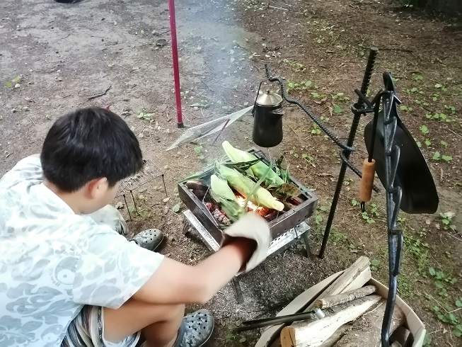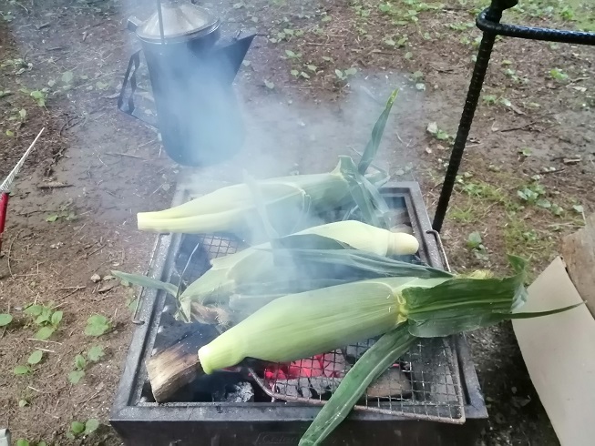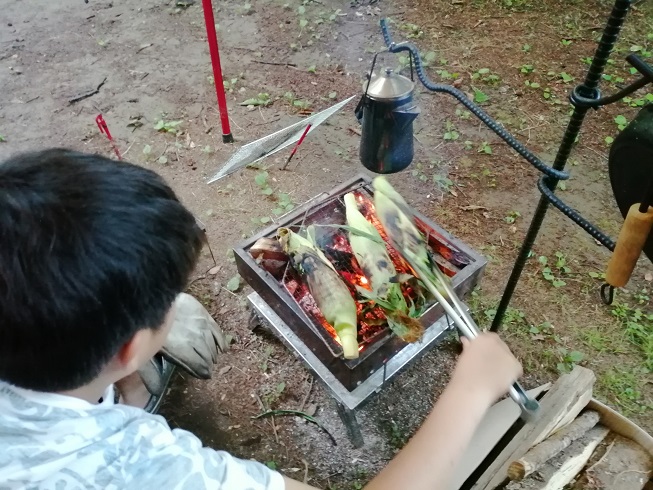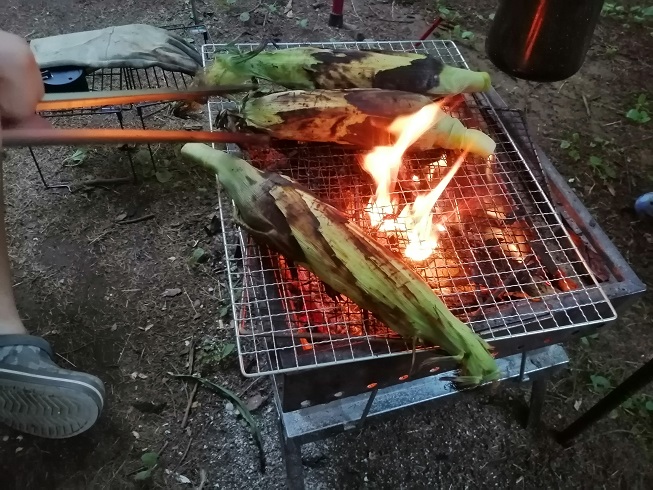 皮のまま、焚火で焼くことでいい感じに蒸し焼きされて、いつもよりおいしいトウモロコシを食べることができます。