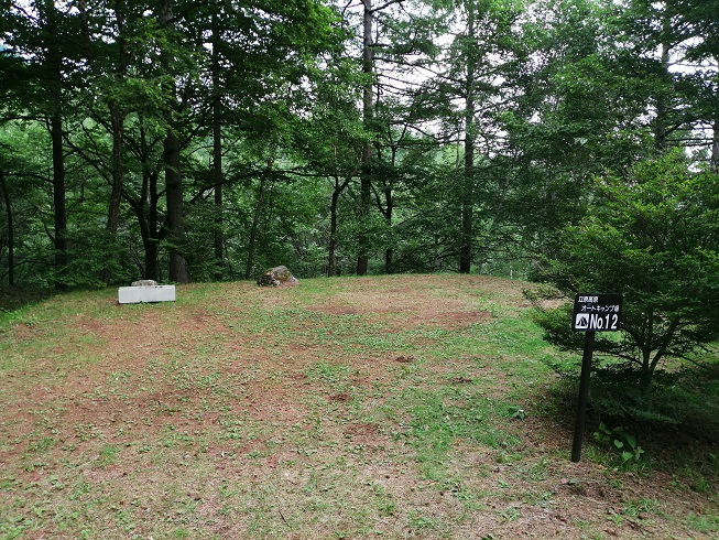 コチラが噂のサニタリーから1番遠い12番サイト。広さはテントとタープを張るには十分なスペースがあります。