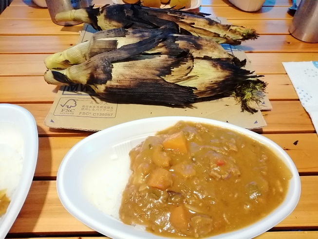 早めに温泉で汗を流し、キャンプ場に戻り夕食の準備。今夜はカレーと焼きとうもろこし。