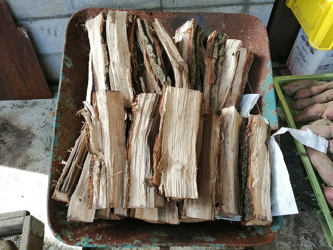 写真の薪は台風15号で倒れた木を薪にした時のものです。現在は台風21号の影響による大雨の土砂崩れの際に大量に発生して倒木(シイ&カシ)の薪が山積みとなっているので、小屋の中の整理整頓をしなくては薪で足の踏み場もありません。