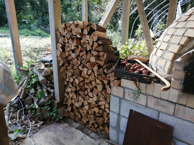 割った薪は石窯の横のスペースに積んで2年ほど乾かしてキャンプの焚き火に使う予定です。