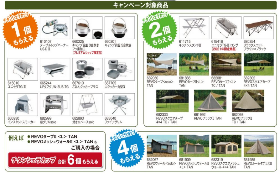 対象商品は全部で25個あります。その中には1つ購入することでシェラカップが2個や4個もらえる商品もあります。