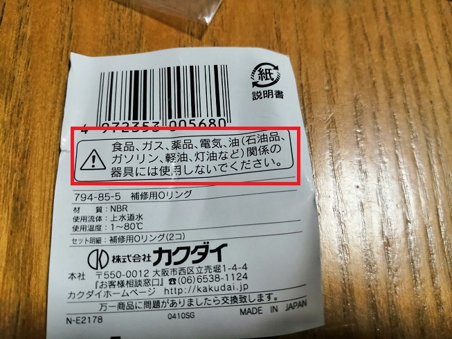 裏面に「食品、ガス、薬品、電気、油(石油品、ガソリン、軽油、灯油など)関係の器具には使用しないでください」の注意書きがありました・・・。
