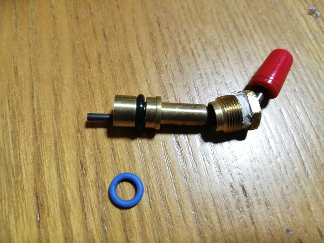 燃料コックを外すと、青いOリングがあります。見た目には劣化は感じられませんが、燃料が漏れ出す原因はコレしかありません。