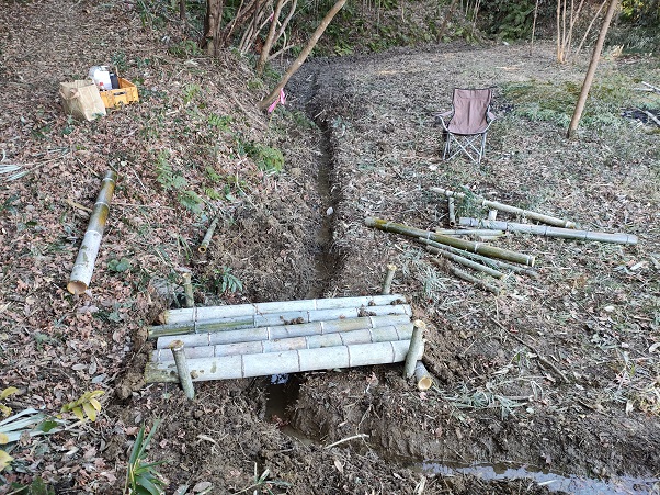 水の流れがスムーズになったのを確認して、今度は水路を跨ぐ竹の橋を作ることにしました。