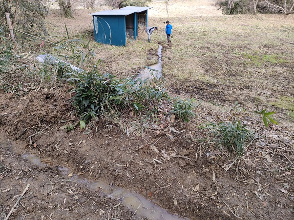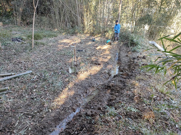 水路にちゃんと水が流れています。奥で次男が木の根元を掘っていますが悪戦苦闘。