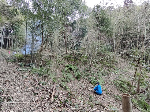 ある程度切ったら、次男に斜面に上がってもらって切れている竹を落としてもらいます。