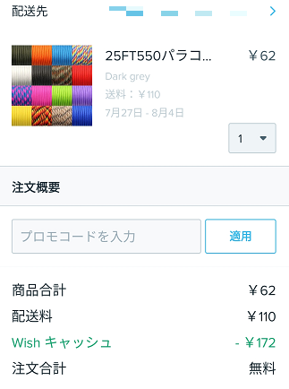 今回、Wishで購入したパラコードは貯まったポイントを使って購入したので、実際には一切支払いを行っていないので、配送されるか心配ではありました。