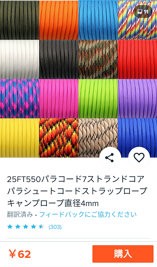 今回はパラコードを購入しましたが、Wishには色々な種類のアイテムが販売されています。